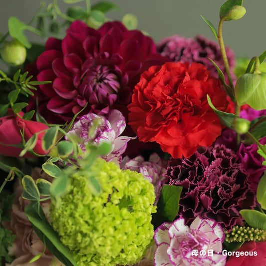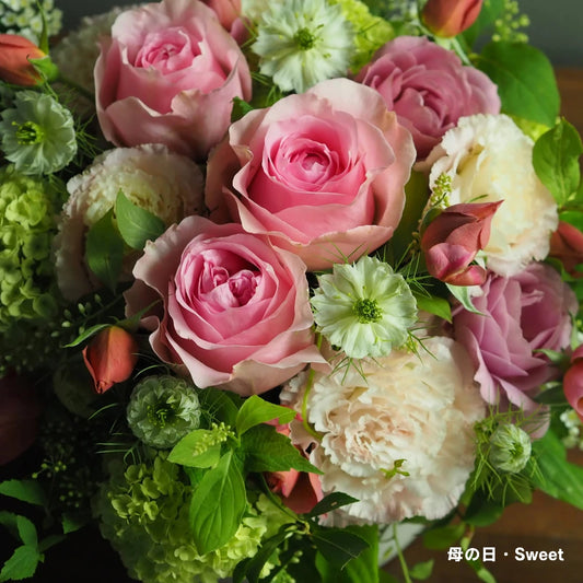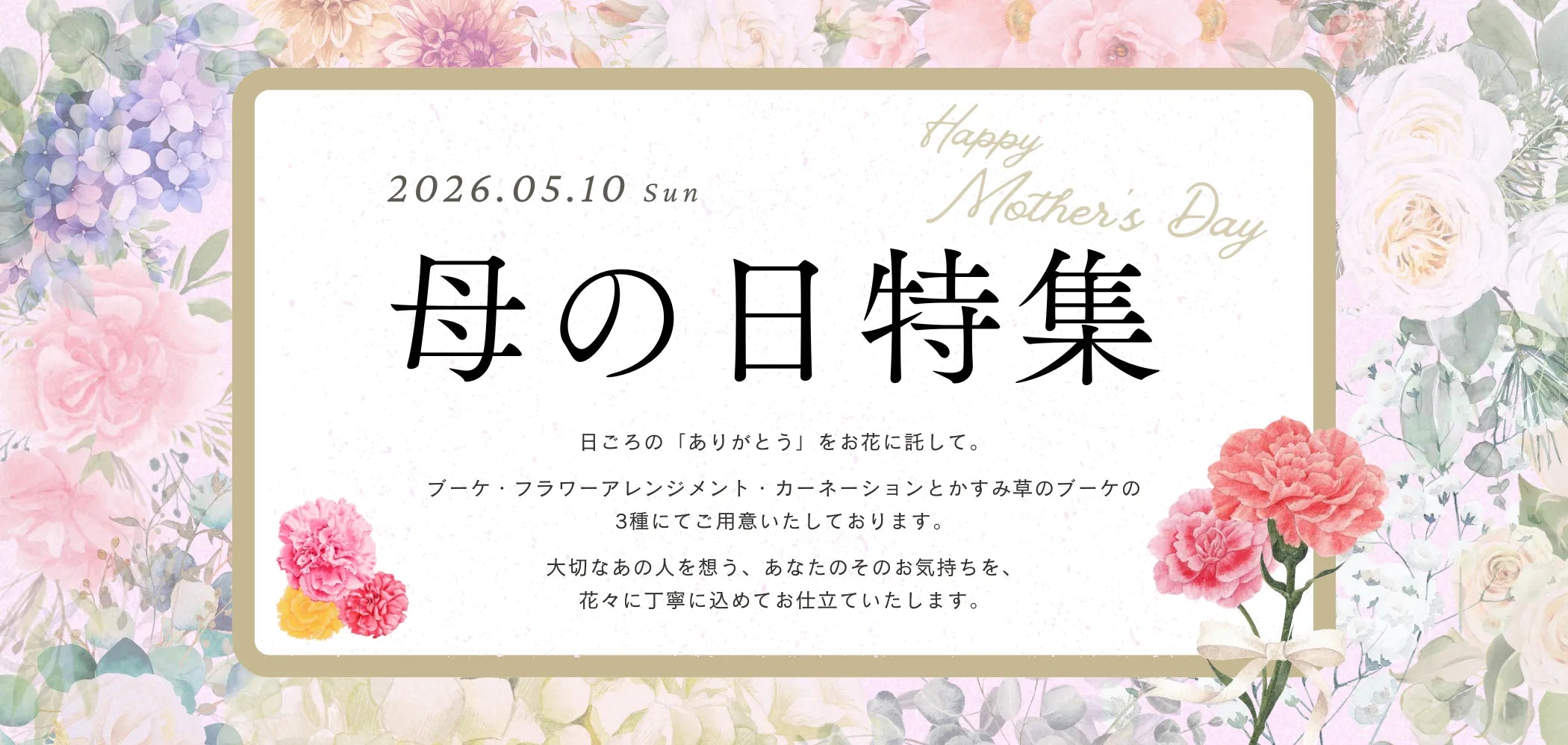 大垣花店では、母の日のお花贈りとして、フラワーアレンジメント・ブーケ・カーネーションとかすみ草のブーケの3種類のスタイルにてお仕立ていたしております。